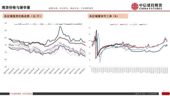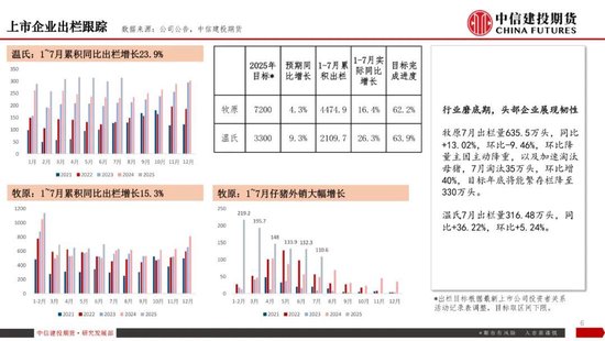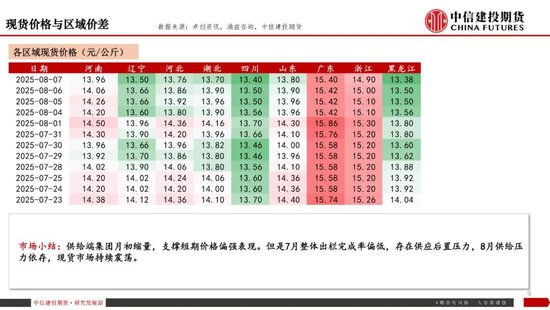 从出栏完成率看,根据卓创、涌益数据,样本企业7月出栏计划完成率在95.7%-97.1%,8月计划出栏量环比增幅在6.6%-7.0%。7月份总体的出栏完成率不及市场预期,导致市场开始关注出栏压力后置的可能性,进一步压低8月份现货的预期。