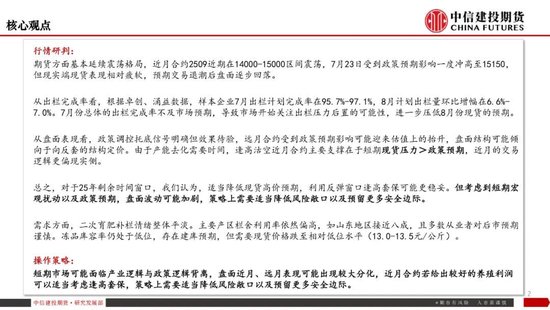 期货方面基本延续震荡格局,近月合约2509近期在14000-15000区间震荡,7月23日受到政策预期影响一度冲高至15150,但现实端现货表现相对疲软,预期交易退潮后盘面逐步回落。